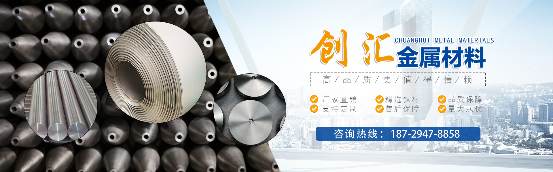 寶雞市創(chuàng)匯金屬材料有限公司,位于有“中國鈦谷”之稱寶雞寶鈦路南段,這里也是國家重點支持和扶持的有色金屬材料資源產(chǎn)業(yè)基地,我司專業(yè)從事鈦、鋯、鉿、鎳鉻、鎢鉬、鉭鈮、合金材料、復(fù)合材料,板、棒、絲、管、箔材等,設(shè)備制造,金屬制品機械加工銷售。